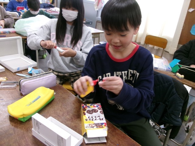 4年3組の図工の授業の様子です。家から持ってきた箱で「おもしろアイデアボックス」...