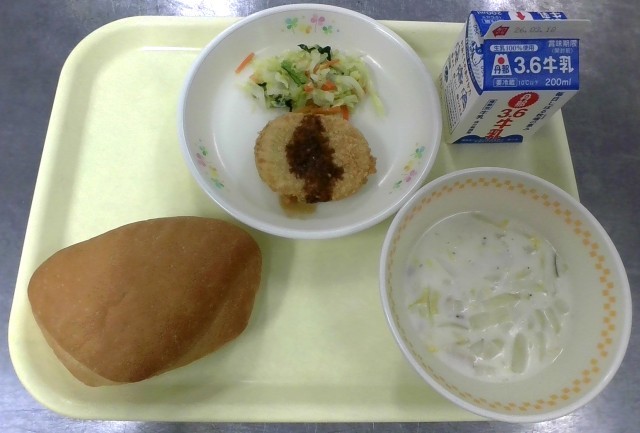二つ折りパン 牛乳 野菜コロッケ 小松菜のソテー ベーコンと白菜のクリームスープ...