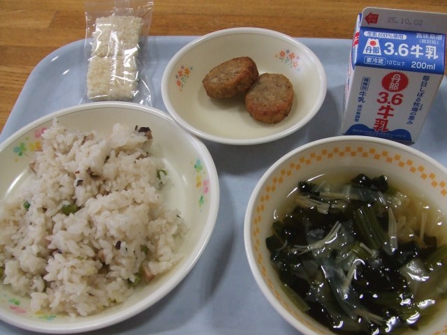 今日のこんだては、炊き込みチャーハン、ぎゅうにゅう、レバー入りつくね、おこげの中華スープです。