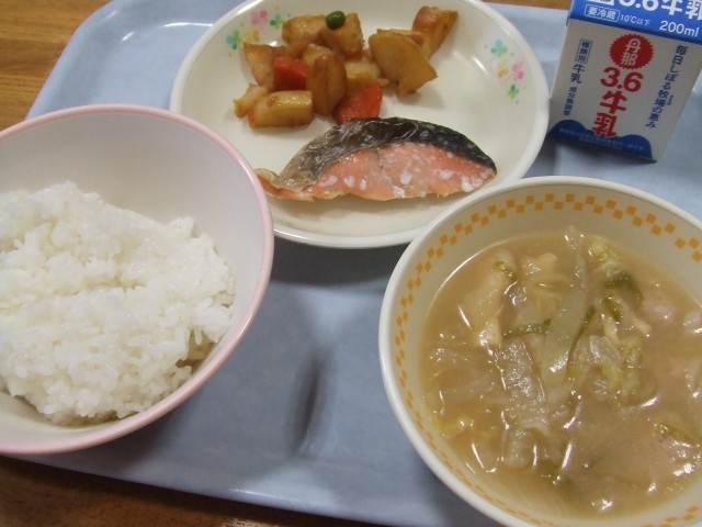 今日のこんだては、ごはん、ぎゅうにゅう、焼き塩鮭、ジャガイモの揚げ絡め、肉団子汁です。