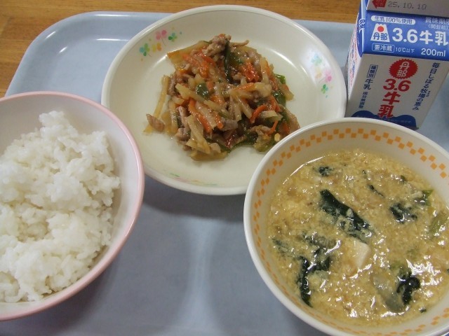 今日のこんだては、ごはん、ぎゅうにゅう、チンジャオロース、たまごとコーンのスープです。