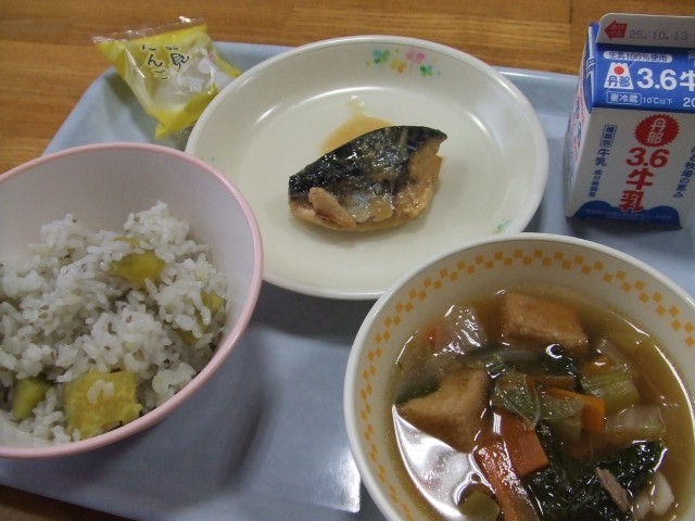 今日のこんだては、さつまいもごはん、サバの味噌煮、生揚げと白菜のスープ、お月見団子です。