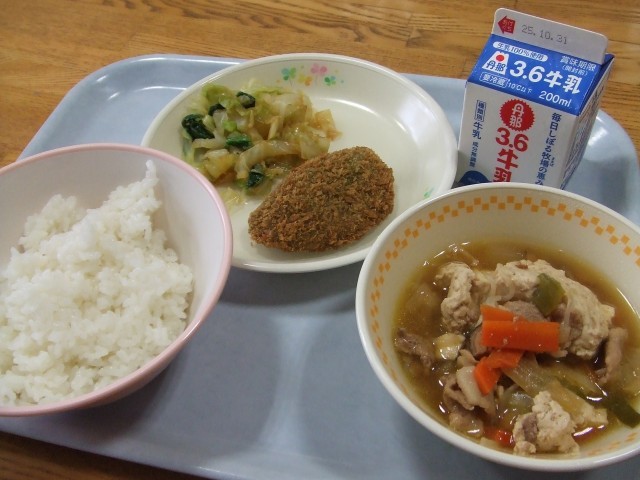 今日のこんだては、ごはん、ぎゅうにゅう、肉豆腐、黒はんぺんお茶フライ、おひたしです。