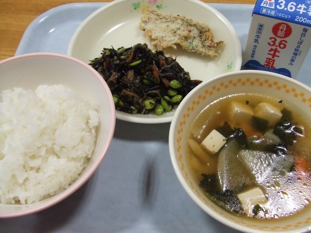今日のこんだては、ごはん、ぎゅうにゅう、ホキのパン粉焼き、ひじきの炒め煮、とり肉と野菜のすまし汁です。