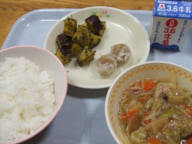 今日のこんだては、ごはん、ぎゅうにゅう、八宝菜、ポークシュウマイ、大学芋です。