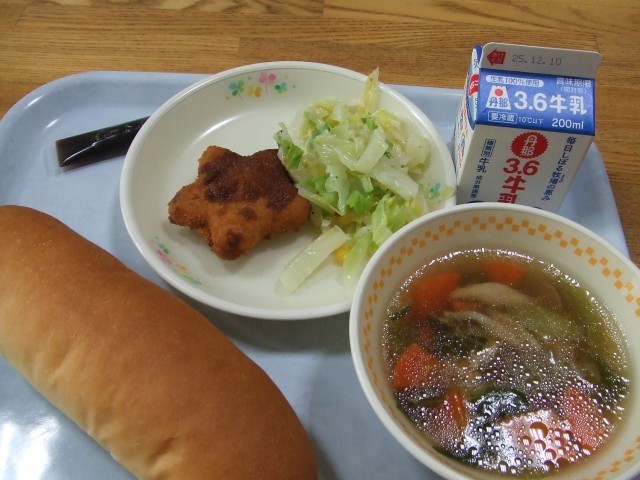 今日の給食(12月2日) 公開日 2025/12/03 更新日 2025/12/03 今日の給食 今日のこんだては、ロールパン、ぎゅうにゅう、星のコロッケ、だいこんサラダ、肉団子と野菜のスープ、コーヒー牛乳のもとです。 冬野菜がたっぷり入ったサラダやスープでした。星型のコロッケもおいしそうです。 いいね(0)