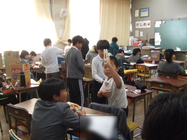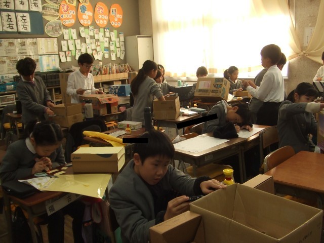 段ボールを使って工作をしています。思い思いの形や飾りを工夫しています。