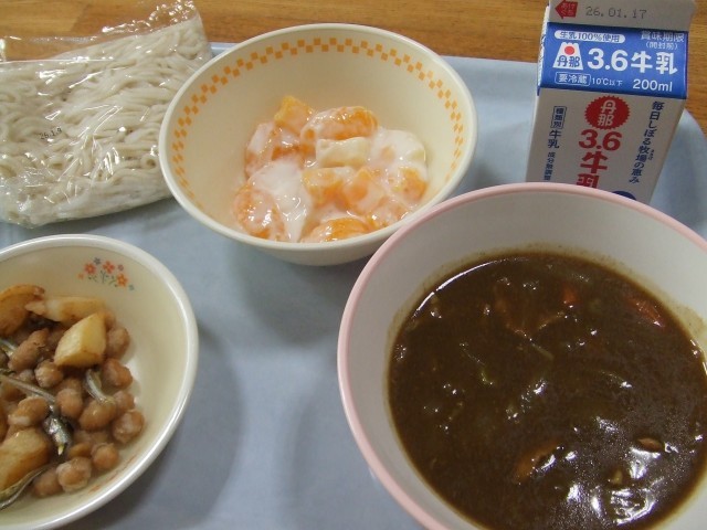 今日の給食(1月9日) 公開日 2026/01/09 更新日 2026/01/09 今日の給食 今日のこんだては、ソフトめん、ぎゅうにゅう、カレーソース、じゃがいもと小魚のからあげ、フルーツヨーグルトです。 少しあまめのカレーソースがめんに合います。からあげやフルーツヨーグルトもとてもおいしいです。 いいね(0)