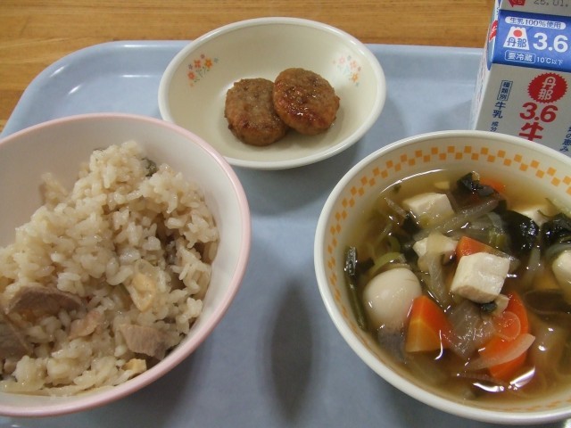 今日の給食(1月14日) 公開日 2026/01/14 更新日 2026/01/14 今日の給食 今日のこんだては、切り干しだいこんと豚肉のごはん、ぎゅうにゅう、レバー入りつくね、ウズラたまごと豆腐のすまし汁です。 ごはんもすまし汁も具だくさんで出汁がとてもおいしいです。つくねも歯ごたえがあっておいしいです。 いいね(0)