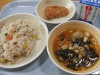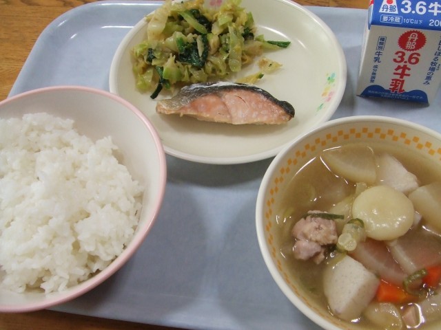 今日のこんだては、ごはん、ぎゅうにゅう、焼き鮭、ごま和え、すいとんです。