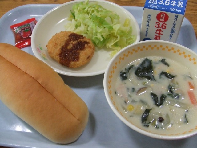 今日のこんだては、コッペパン、ぎゅうにゅう、コロッケ、ボイルドキャベツ、ミルクスープ、いちごジャムです。