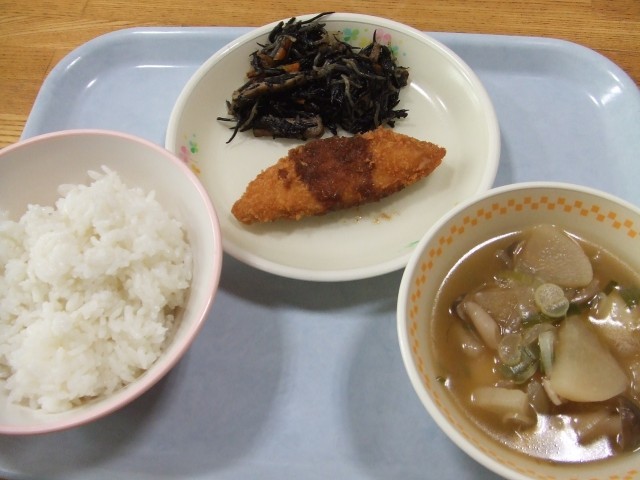 今日の給食(2月9日) 公開日 2026/02/09 更新日 2026/02/09 今日の給食 今日のこんだては、ごはん、あじフライ、ひじきと大豆の炒め煮、だまこ餅汁です。 体が温まりそうな献立です。 いいね(0)
