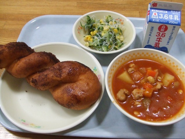 今日の給食(2月17日) 公開日 2026/02/17 更新日 2026/02/17 今日の給食 今日のこんだては、ココア揚げパン、ぎゅうにゅう、鶏肉と大豆のトマトスープ、はるさめサラダです。 ココア味の揚げパンや温かいスープ、さっぱりしたサラダなど、今日もとてもおいしそうです。 いいね(0)