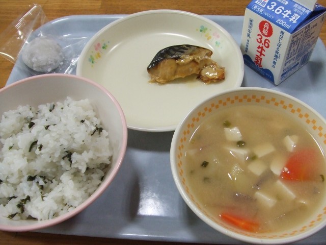 今日のこんだては、わかめごはん、ぎゅうにゅう、サバの静岡みかん煮、鶏肉と根菜のみそ汁、静岡茶クリーム大福です。