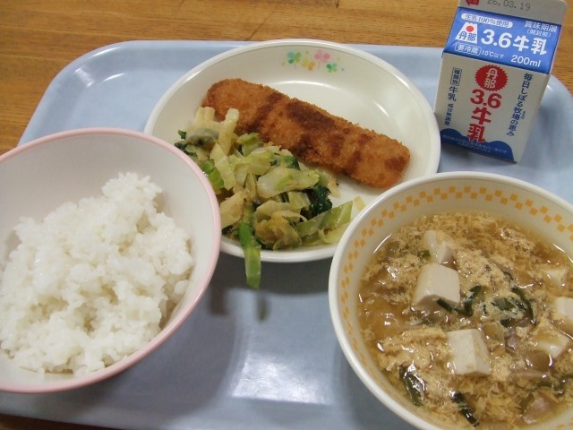 今日のこんだては、ごはん、ぎゅうにゅう、太刀魚のフライ、ごまあえ、かき玉汁です。
