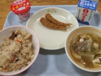 今日のこんだては、ごはん、ぎゅうにゅう、たちうおのからあげ、ごまあえ、とうふとじゃがいものみそしるです。