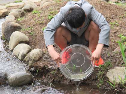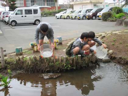 昨年度末、ビオトープの改修工事を行ったときにめだかを水槽の中に一時避難させていました。工事も終わり、池の中も落ち着いたため、めだかを池の中に戻しました。一時避難の際にも活躍した環境美化委員にめだかたちを戻してもらいました。めだかたちは、池の中で元気に泳いでいます。