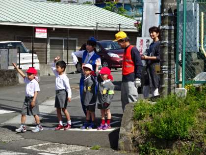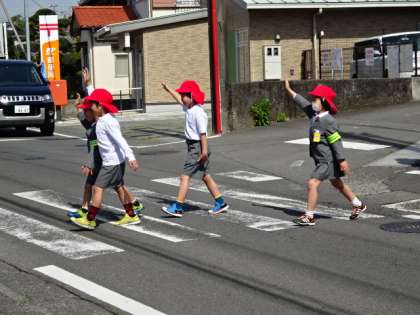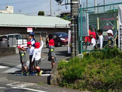 いつもより、緊張して横断歩道を渡っていました。浮島地区交通安全連合会の皆様にも支援していただきました。