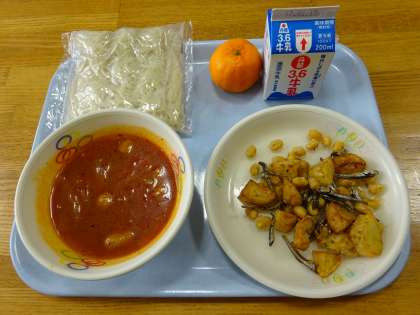 今日の献立:つけナポリタン・牛乳・ポテトと大豆の唐揚げ・ぽんかん