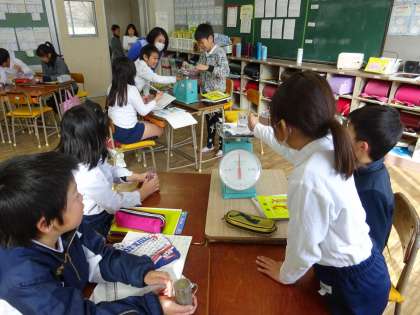 ○今日は3年1組の算数「もののかさと重さ」の授業を参観しました。1㎗ますに入った水と砂の重さを測定して、かさが同じでも重さがちがうことが分かりました。