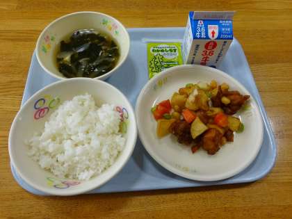 今日の献立:ごはん・牛乳・鶏肉とじゃがいもの揚げ煮・コーンスープ・わかめしらすふりかけ