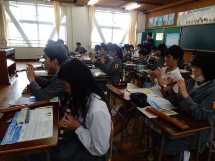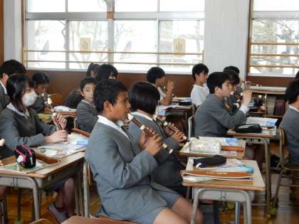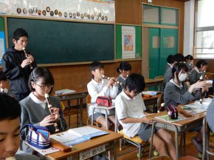音楽室から聞こえてくるリコーダーの音色に、音楽室をのぞいてみると、六年生が、リコーダーの練習をしていました。高いドのシャープの音は、なかなか出すのが難しいようで、みんな何回も練習していました。