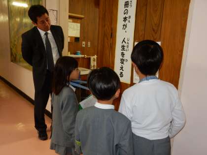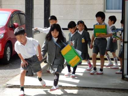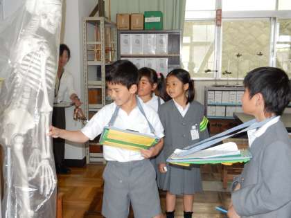 2年生に手をひかれながら、1年生が学校探検を行いました。校舎の地図を見ながら、一生懸命1年生にどんな教室があるか説明していました。特別教室をのぞく1年生は、とてもうれしそうでした。理科室では、おそるおそるがいこつの模型ににさわる人もいました。音楽室では、上級生が学ぶ席に座ってまわりを見まわす人もいました。1年生の手をひく2年生のおにいさん、おねえさんは、ちょっぴりたのもしく見えました。