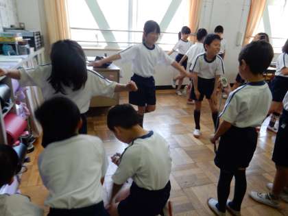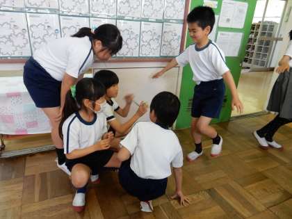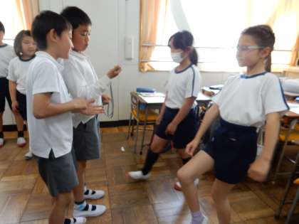 3年生が、算数の「時間と時刻」の学習をしていました。1分より短い時間の表し方を考えたり、目をつぶって片足立ちしている時間をストップウオではかったりして、みんな楽しそうに1分前後の時間の感覚を確かめていました。