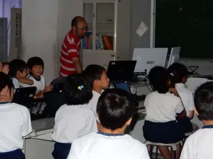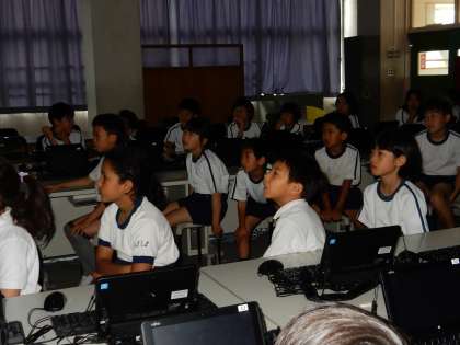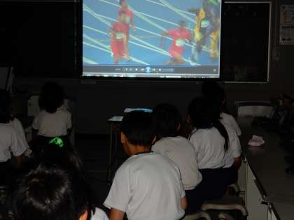 運動会まであと2日というのにあいにくの雨でリレーの練習ができなかった3年生ですが、パソコン室に向かいます。何をするんだろうと後をついて行ってみたら、リオ五輪の時の男子リレーの決勝の様子をみんなでビデオで見ていました。「バトンをもらう時は前を見て走っているよね。」という担任の先生の言葉に、子どもたちはもう一度ビデオの日本選手のバトンパスを見て、「すごい。」と歓声をあげていました。パソコン室から戻るときは、リレーを今すぐやりたそうでした。