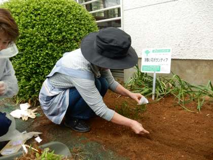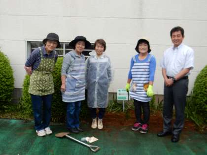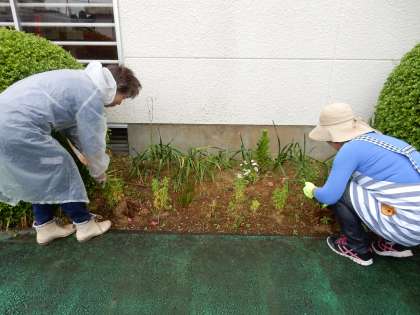 雨の合間をぬって、今年も「花ボランティア」の方々が、花壇をきれいにしてくださいました。秋に咲く秋桜の種をまき、まわりの花を整えてくださいました。秋になり、風にゆられながら咲く秋桜を眺めるのが、今から楽しみです。ありがとうございました。