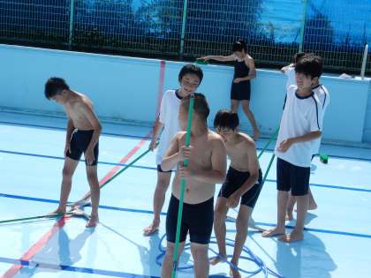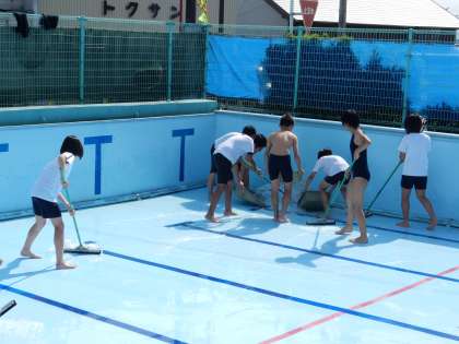 7日のプール開きを前に、6年生がプール清掃を行いました。最初は緑色だったプールもすっかりきれいになりました。「最初にプールに入るのは、1年生だよ。」という担任の先生の言葉に、6年生のプール清掃は、いっそう熱が入りました。