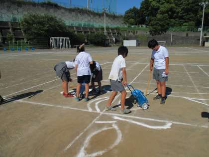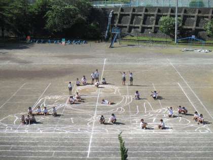 歴史の勉強をしている6年生が、実際に奈良の東大寺にある大仏は、どのくらいの大きさなのか、運動場に実物大の大仏をみんなでかいて確かめました。あらためてその大きさと、先人のすごさを実感しているようでした。
