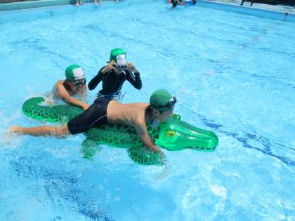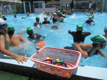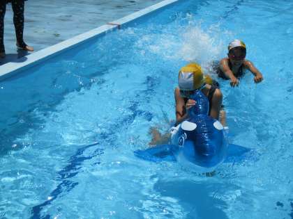 浮島小プールに「ワニ」と「シャチ」が出現。リレー対決は、安定感の勝ったワニが勝利したようです。この他に「宝探しゲーム」も行いました。みんな思いっきりプール開きを楽しんでいました。
