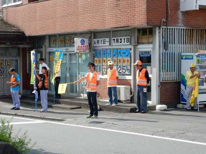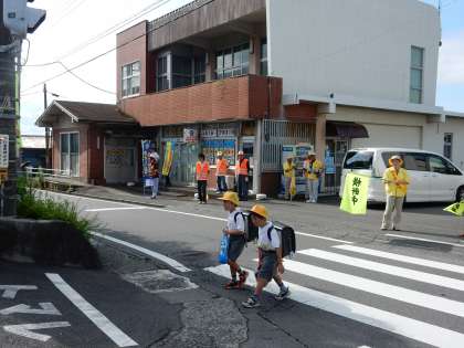 夏の交通安全県民運動1日目、朝から日ざしが強い中、浮島交通安全連合会のみなさまが、通学路にたって、子どもたちの安全を見守ってくださいました。