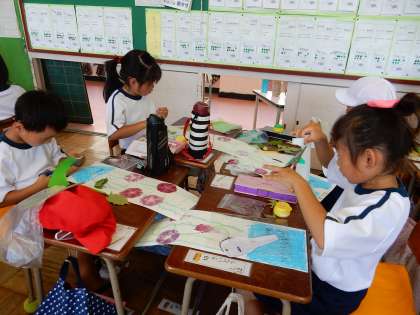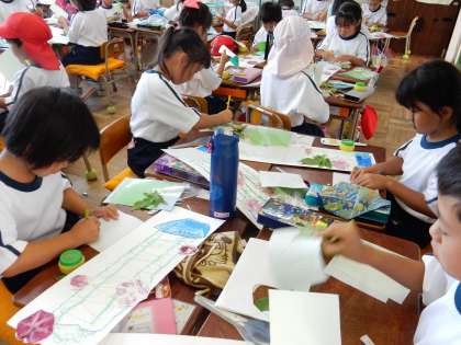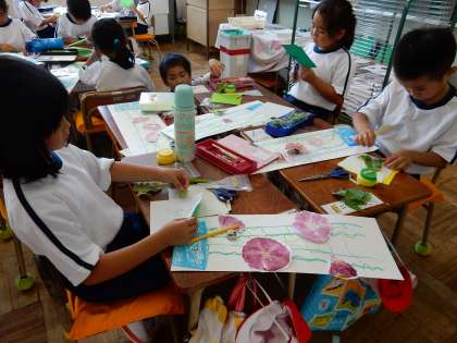 1年生が、種をまき、水をやり大事に育ててきたあさがおが、たくさんあざやかな色の花を咲かせました。花びらを使ってこすり染めに挑戦し、自分が描いた鉢に花を咲かせていました。できあがったもう一つのあさがおにみんなうれしそうでした。