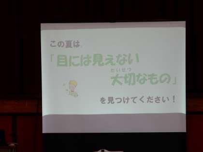 1学期の終業式に、校長先生が「星の王子さま」に書かれている一文を紹介されました。「大切なものは目に見えない。」夏休みには、自分にとって大切なもの見つけることができるといいですね。とおっしゃいました。そして、夏休みの「あいうえお」について岩本先生がお話してくださいました。どちらも、意識して夏休みが過ごせるといいです。