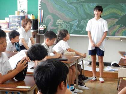 5年生は、「夏休みじまん大会」を開き、くじ引きで当たった人の話をみんな楽しそうに聞いていました。