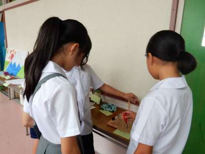 6年生は、友達が作ってきた工作作品を興味深げにみんなで見ていました。