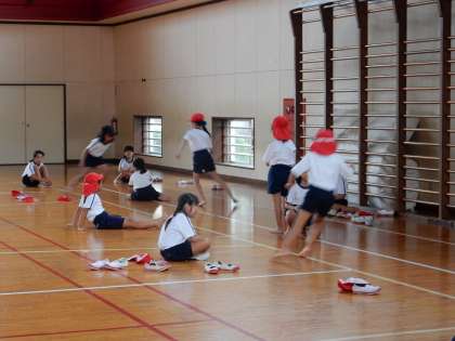 3年生は、もうすぐ行われる新体力テストに向けて、反復横跳びの練習を行い、だいぶリズムよく跳ぶことができるようになりました。