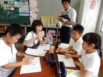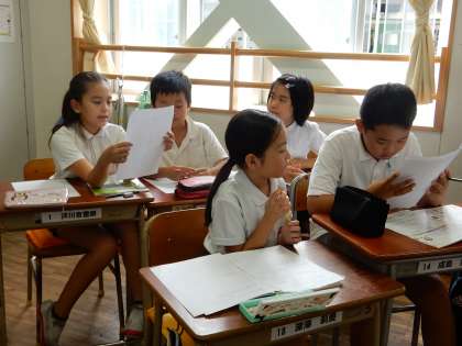 4年生は、読解の時間に、ごみの分別の仕方についてインタビューをしてきたことを、ペアで伝え合いました。国語の時間には、包装紙の特徴をグループで見比べながら、気づいたことを伝え合いました。