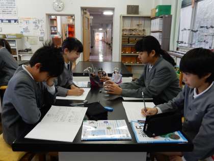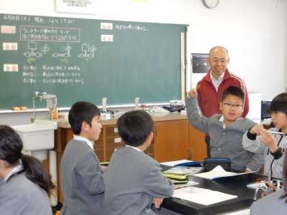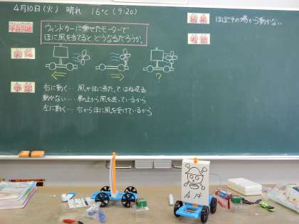 5年生が、理科の授業で、帆の付いた車がなぜ動かないのかグループで、自分の考えたことを伝え合い合いました。自分の予想とは違った車の動きに、みんなの「?」は、広がっていきました。楽しい理科の始まりです。