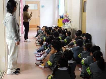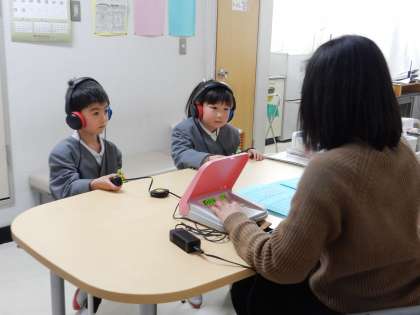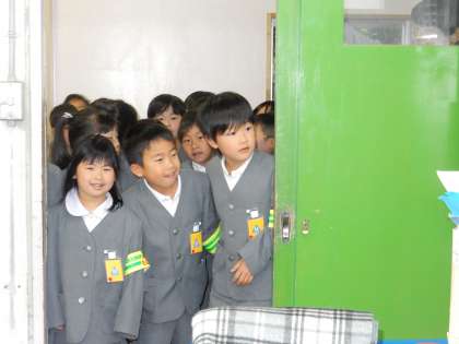 1年生が、聴力検査に行く途中、職員室の中を見ていきました。本格的な学校探検はこれからですが、とても興味深げに職員室の中をのぞいていました。その後行われた保健室での聴力検査は、みんなとても真剣でした。