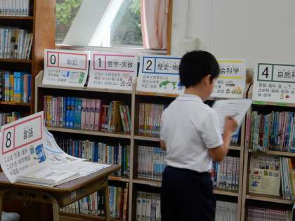 学校司書の森野先生に、図書館にある本の分類の仕方を教えていただいた後、日本十進分類法に合わせて自分の探している本を見つけると、ちょっとうれしそうでした。