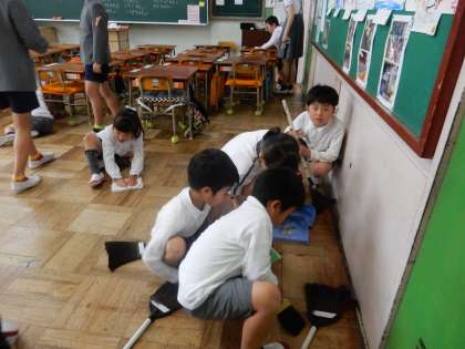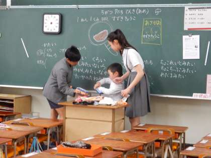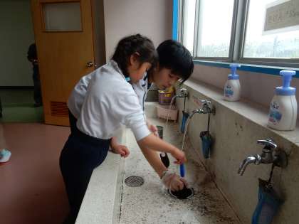 連休明けの月曜日、給食を食べた後、1年生が、自分たちの教室、流し、廊下や階段を掃除しました。場所に合った掃除のやり方を、6年生が丁寧に教えてくれました。
