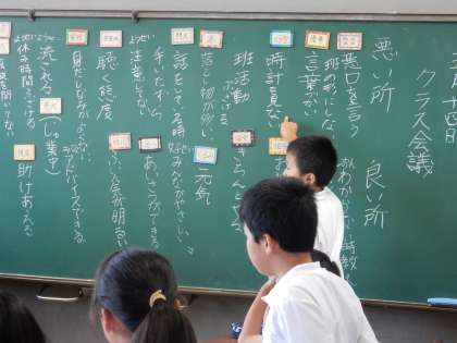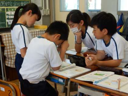 5年生が、グループで自分たちの考えや思いを伝え合っていました。1組では、算数の時間に「平均のもとめかた」について考えていました。2組では、学級会で出てきたクラスの問題を改善するために、何をしていけばよいのかについて意見を出し合いました。