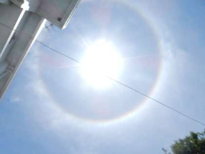 「あれは何?」「わあすごい。」という運動会の練習後の1,2年生の声に空を見上げたら、浮島小の真上に「日輪」がありました。何とも不思議な感じがして写真に撮りました。「日輪」は、上空に薄雲がかかった時に見える太陽の外側に現れる輪なのだそうです。