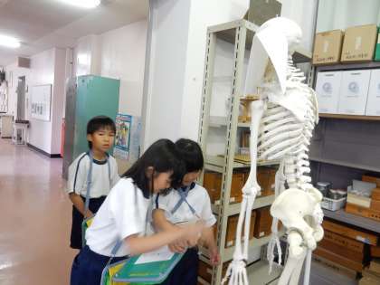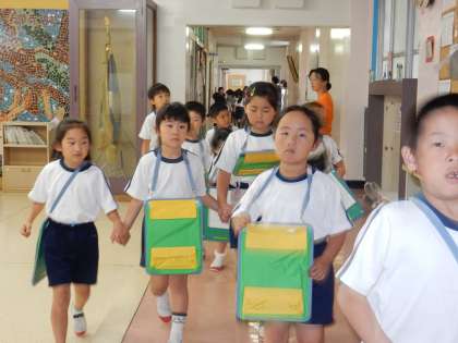 1,2年生が、生活科の時間に学校探検を行いました。2年生が、1年生の手をひきながら、それぞれの教室の説明を一生懸命していました。