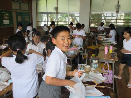 4−1音楽「オリジナル楽器をつくろう」様々な材料を使って興味深く音を研究、制作していました。