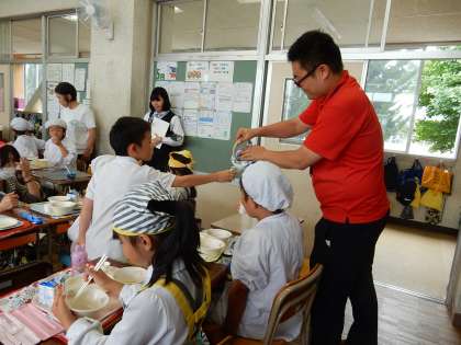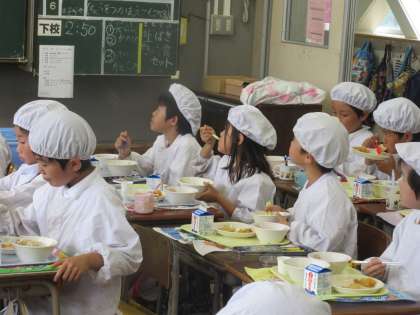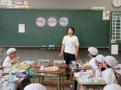 「茶飯」の給食の日にあわせて、お茶生産者の方々が、3年生に新茶を入れてくださり、日本茶インストラクターの方が、お茶の効能についてお話してくださいました。日頃からお茶にはなじみのある子どもたちですが、おいしい新茶をいただき、お茶が体にいいことを知り、ますますお茶に親しみがわいたようでした。みんなおいしいお茶を、何杯もおかわりしていました。3年生は、これから社会の勉強で沼津市の特徴について学習していきます。総合的な学習の時間には、さらにお茶についてくわしく調べていきます。