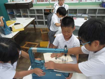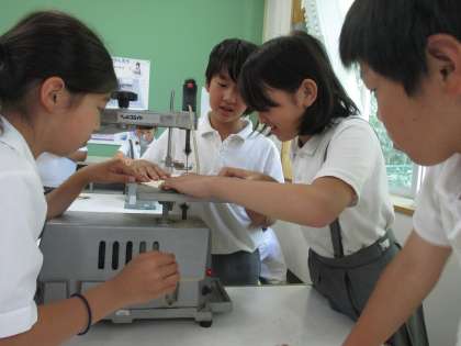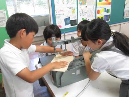 5年生が、図工の時間に電動のこぎりを使って板を切り、迷路のパーツを作りました。初めて使う電動のこぎりに、最初はこわごわ手を動かしていましたが、友達と協力しながら板を動かし、自分が切りたい形を作ることができると、とてもうれしそうでした。
